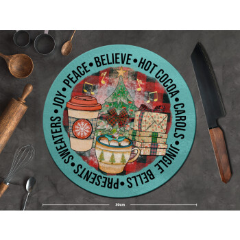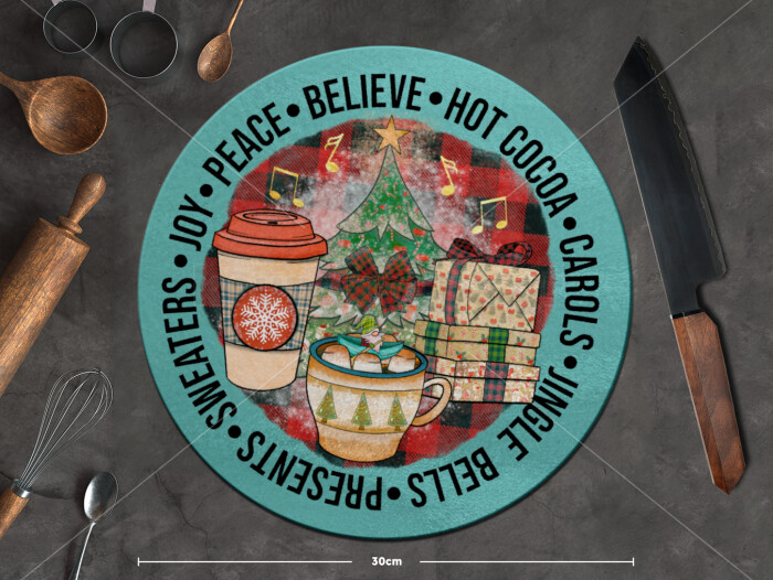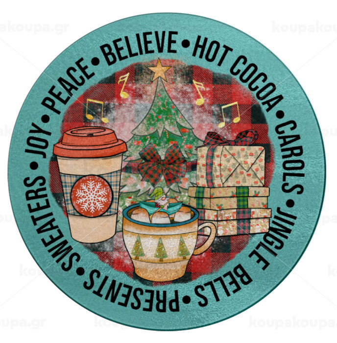 Joy, Peace, Believe, Hot Cocoa, Carols, Επιφάνεια κοπής γυάλινη στρογγυλή (30cm)
