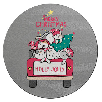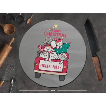 Merry Christmas cats in car, Επιφάνεια κοπής γυάλινη στρογγυλή (30cm)