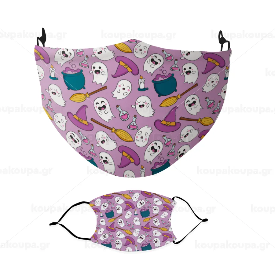 Happy Halloween pink, Μάσκα υφασμάτινη Ενηλίκων πολλαπλών στρώσεων με υποδοχή φίλτρου