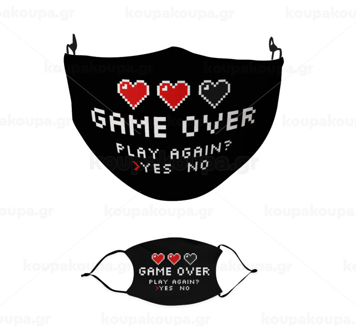 GAME OVER, Play again? YES - NO, Μάσκα υφασμάτινη παιδική πολλαπλών στρώσεων με υποδοχή φίλτρου