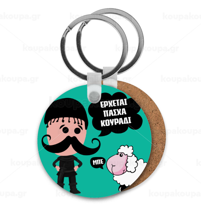 Κρητικός "Έρχεται Πάσχα κουράδι", Μπρελόκ Ξύλινο στρογγυλό MDF Φ5cm