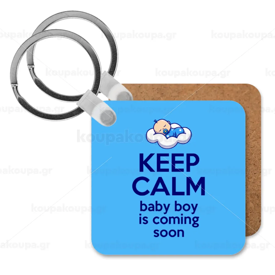 KEEP CALM baby boy is coming soon!!!, Μπρελόκ Ξύλινο τετράγωνο MDF