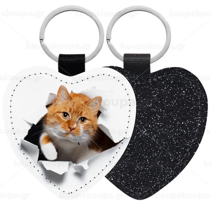 Cat cracked, Μπρελόκ PU δερμάτινο glitter καρδιά ΜΑΥΡΟ