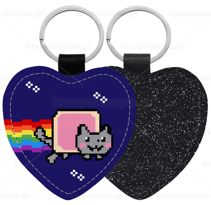 Nyan Pop-Tart Cat, Μπρελόκ PU δερμάτινο glitter καρδιά ΜΑΥΡΟ