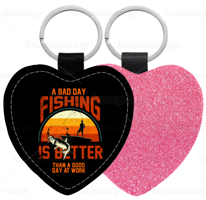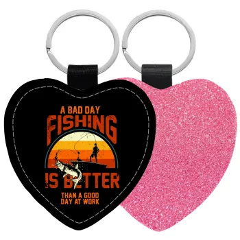 A bad day FISHING is better than a good day at work, Μπρελόκ PU δερμάτινο glitter καρδιά ΡΟΖ