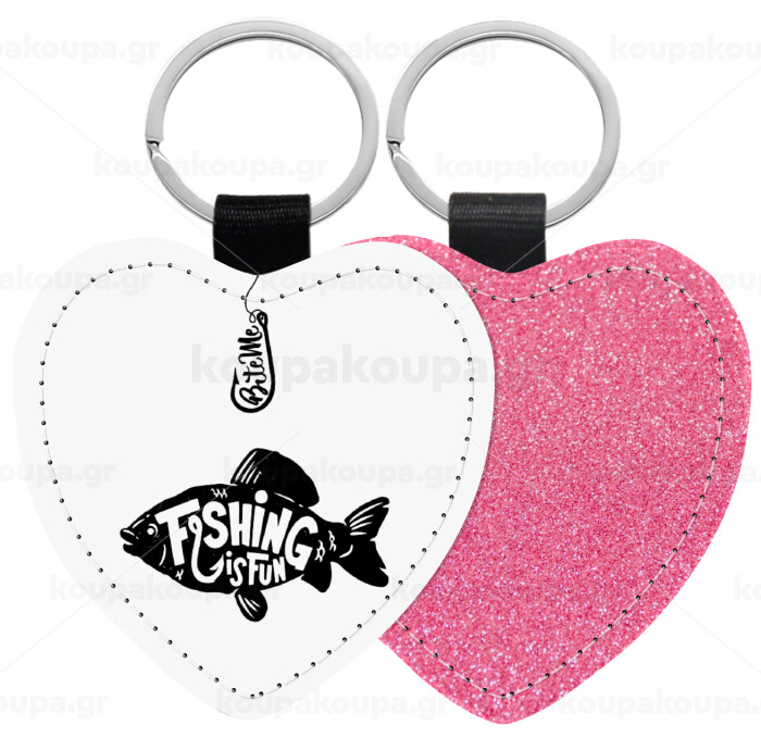 Fishing is fun, Μπρελόκ PU δερμάτινο glitter καρδιά ΡΟΖ
