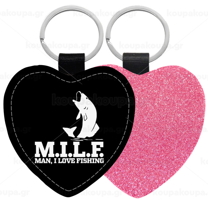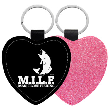 M.I.L.F. Mam i love fishing, Μπρελόκ PU δερμάτινο glitter καρδιά ΡΟΖ