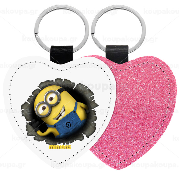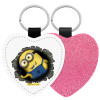 Minions hi, Μπρελόκ PU δερμάτινο glitter καρδιά ΡΟΖ