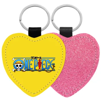 Onepiece logo, Μπρελόκ PU δερμάτινο glitter καρδιά ΡΟΖ