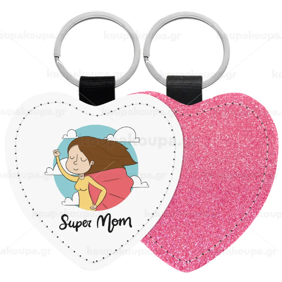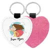 Super mom, Μπρελόκ PU δερμάτινο glitter καρδιά ΡΟΖ