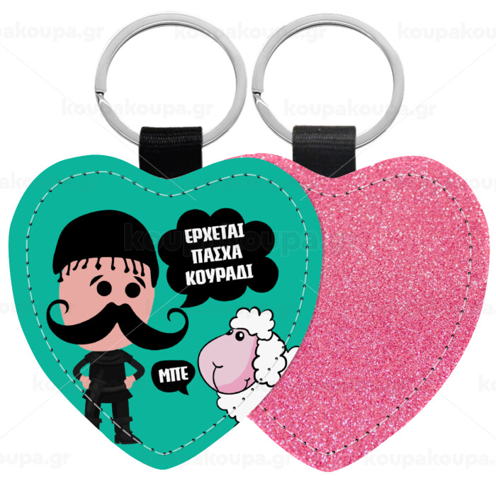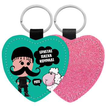 Κρητικός "Έρχεται Πάσχα κουράδι", Μπρελόκ PU δερμάτινο glitter καρδιά ΡΟΖ