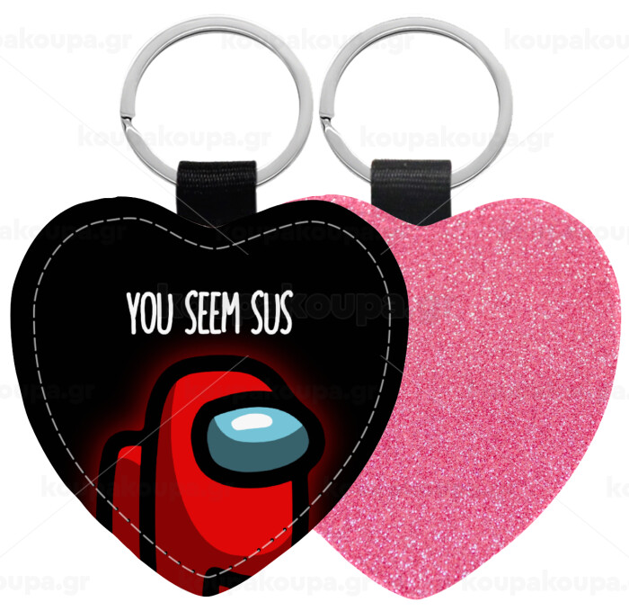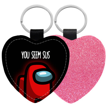 Among US, you seem sus, Μπρελόκ PU δερμάτινο glitter καρδιά ΡΟΖ