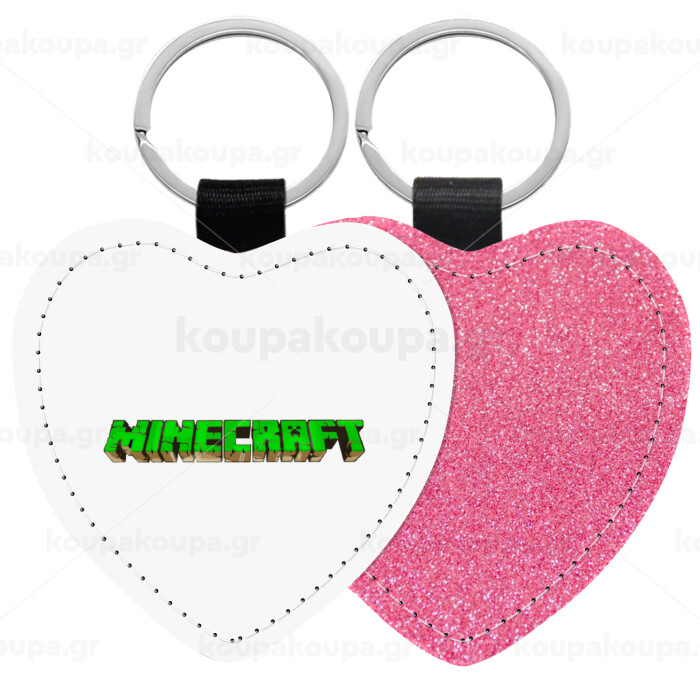 Minecraft logo green, Μπρελόκ PU δερμάτινο glitter καρδιά ΡΟΖ