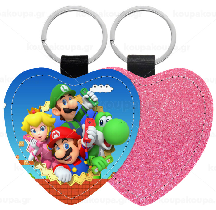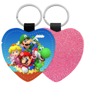 Super mario and Friends, Μπρελόκ PU δερμάτινο glitter καρδιά ΡΟΖ