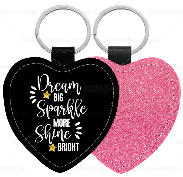 Dream big, Sparkle more, Shine bright, Μπρελόκ PU δερμάτινο glitter καρδιά ΡΟΖ