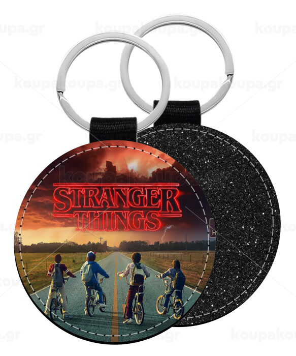 Stranger Things city, Μπρελόκ Δερματίνη, στρογγυλό ΜΑΥΡΟ (5cm)