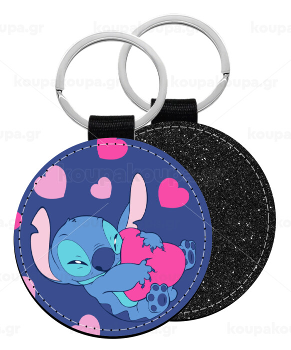 Lilo & Stitch hugs and hearts, Μπρελόκ Δερματίνη, στρογγυλό ΜΑΥΡΟ (5cm)