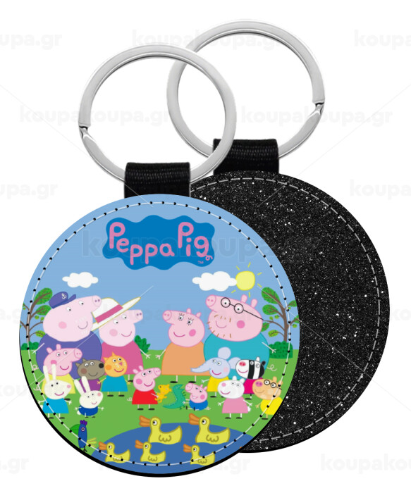 Peppa pig Family, Μπρελόκ Δερματίνη, στρογγυλό ΜΑΥΡΟ (5cm)