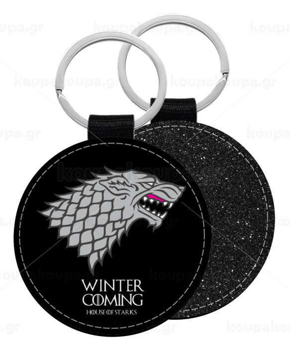 GOT House of Starks, winter coming, Μπρελόκ Δερματίνη, στρογγυλό ΜΑΥΡΟ (5cm)