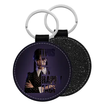 Wednesday, This is my happy face, Μπρελόκ Δερματίνη, στρογγυλό ΜΑΥΡΟ (5cm)