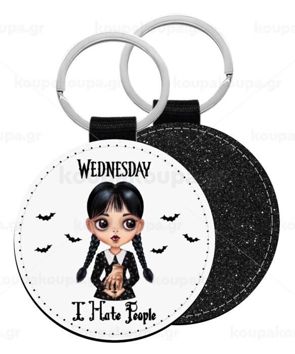Wednesday Adams, i hate people, Μπρελόκ Δερματίνη, στρογγυλό ΜΑΥΡΟ (5cm)