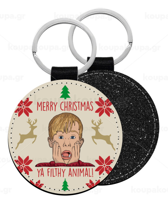 home alone, Merry Christmas ya filthy animal, Μπρελόκ Δερματίνη, στρογγυλό ΜΑΥΡΟ (5cm)