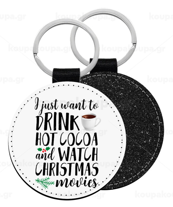 I just want to drink hot cocoa and watch christmas movies, Μπρελόκ Δερματίνη, στρογγυλό ΜΑΥΡΟ (5cm)
