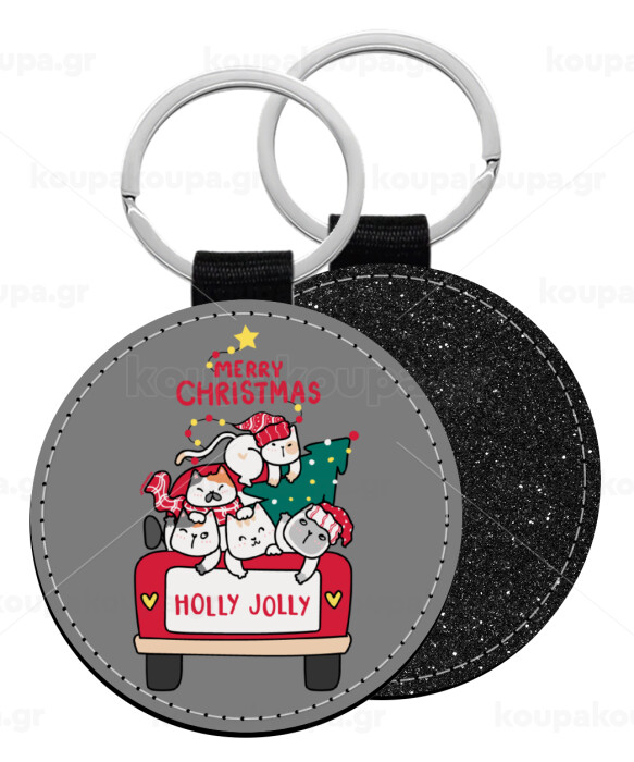 Merry Christmas cats in car, Μπρελόκ Δερματίνη, στρογγυλό ΜΑΥΡΟ (5cm)
