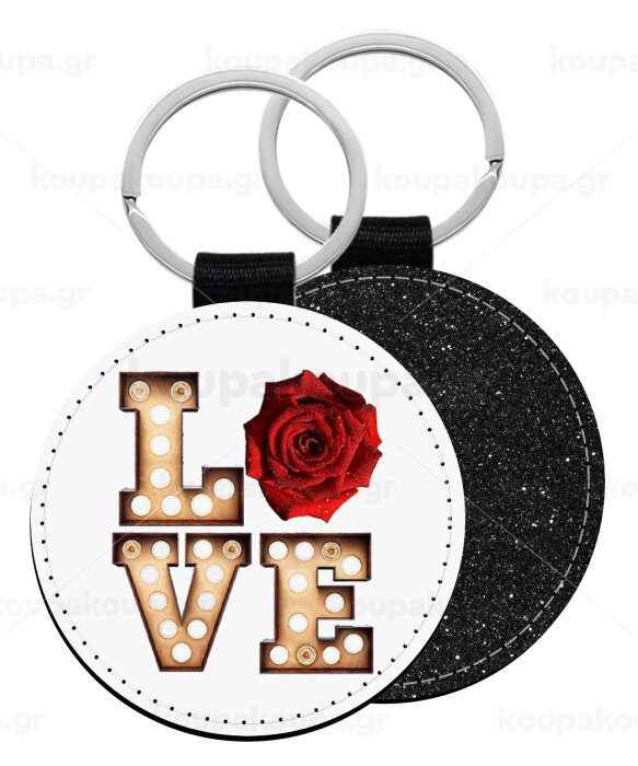 Love lights and roses, Μπρελόκ Δερματίνη, στρογγυλό ΜΑΥΡΟ (5cm)