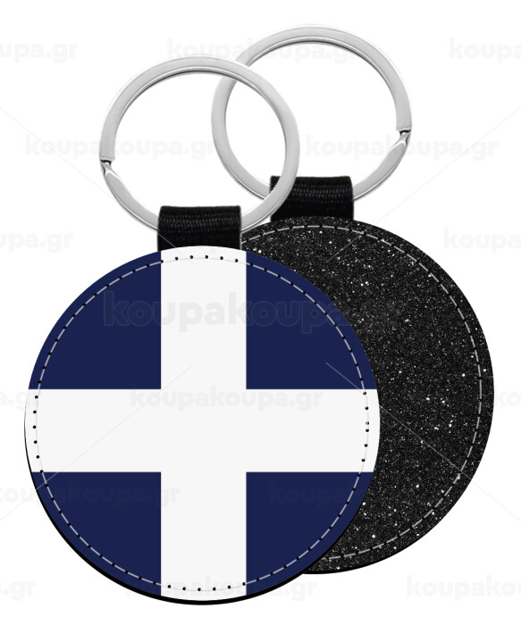 Ελληνική σημαία, Hellas, Μπρελόκ Δερματίνη, στρογγυλό ΜΑΥΡΟ (5cm)