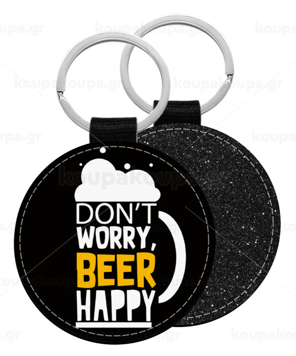 Don't worry BEER Happy, Μπρελόκ Δερματίνη, στρογγυλό ΜΑΥΡΟ (5cm)