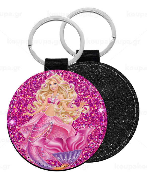 Barbie γοργόνα , Μπρελόκ Δερματίνη, στρογγυλό ΜΑΥΡΟ (5cm)