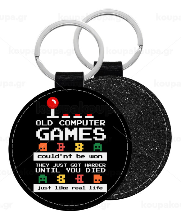 OLD computer games couldn't be won just like real life!, Μπρελόκ Δερματίνη, στρογγυλό ΜΑΥΡΟ (5cm)