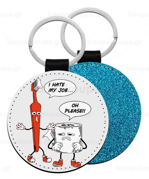 I hate my job, Μπρελόκ Δερματίνη, στρογγυλό ΜΠΛΕ (5cm)