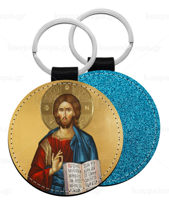 Ιησούς, Μπρελόκ Δερματίνη, στρογγυλό ΜΠΛΕ (5cm)