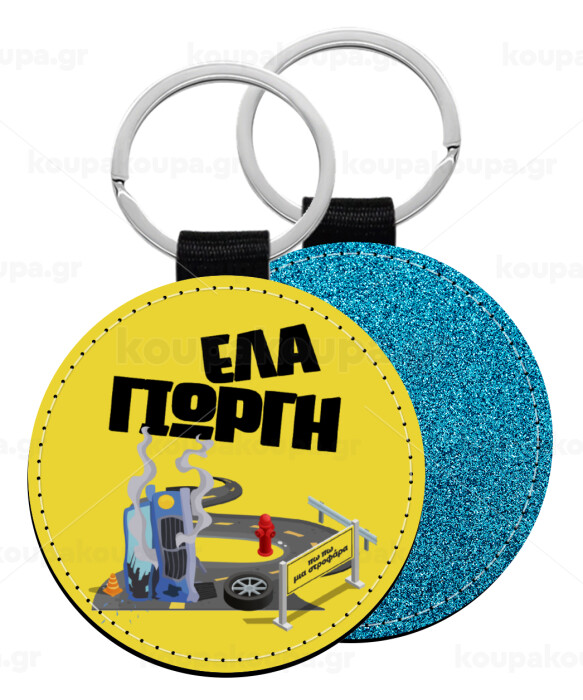 Έλα Γιώργη, πω πω μια στροφάρα, Μπρελόκ Δερματίνη, στρογγυλό ΜΠΛΕ (5cm)