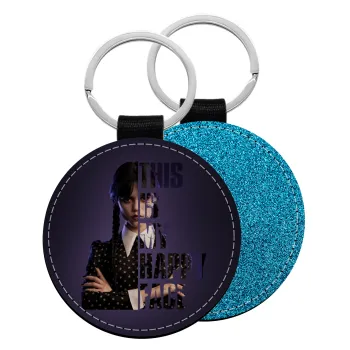 Wednesday, This is my happy face, Μπρελόκ Δερματίνη, στρογγυλό ΜΠΛΕ (5cm)