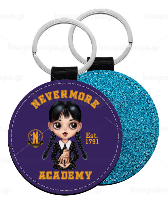 Wednesday Adams, nevermore, Μπρελόκ Δερματίνη, στρογγυλό ΜΠΛΕ (5cm)