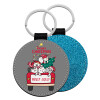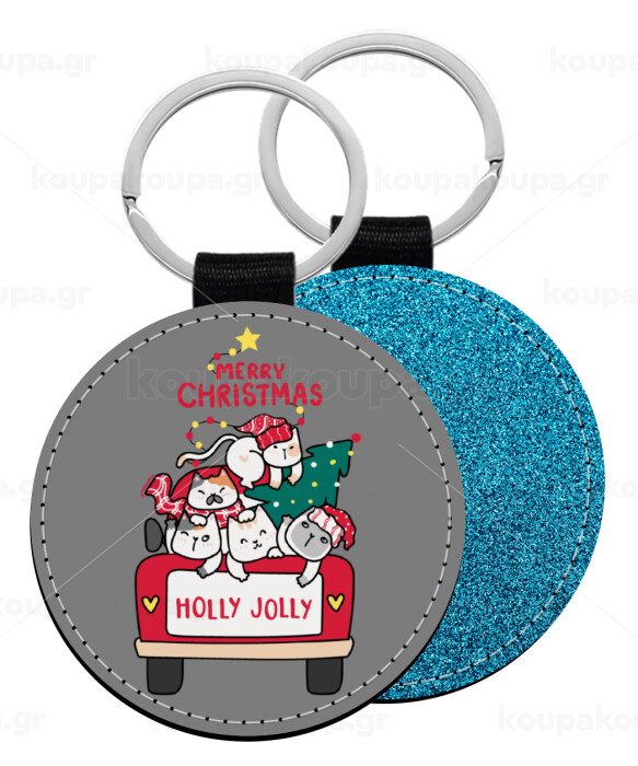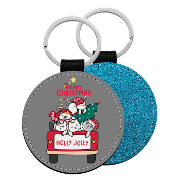 Merry Christmas cats in car, Μπρελόκ Δερματίνη, στρογγυλό ΜΠΛΕ (5cm)