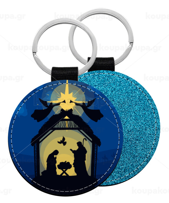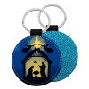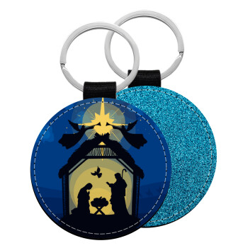 Η γέννηση του Ιησού φάτνη, Μπρελόκ Δερματίνη, στρογγυλό ΜΠΛΕ (5cm)