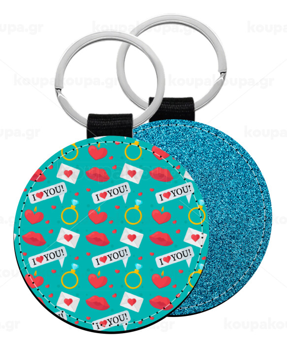 I Love You hearts rings & kiss pattern, Μπρελόκ Δερματίνη, στρογγυλό ΜΠΛΕ (5cm)