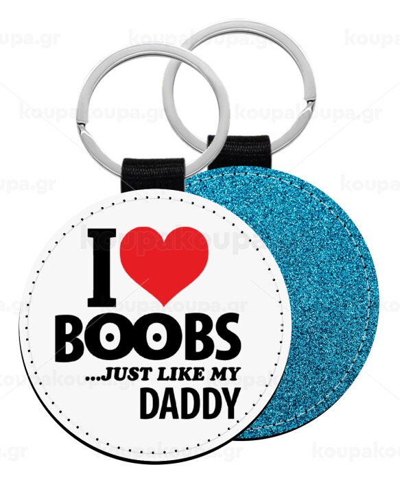 I Love boobs ...just like my daddy, Μπρελόκ Δερματίνη, στρογγυλό ΜΠΛΕ (5cm)