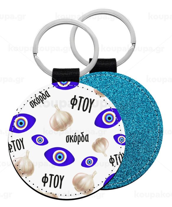 Φτου, φτου, σκόρδα!!!, Μπρελόκ Δερματίνη, στρογγυλό ΜΠΛΕ (5cm)