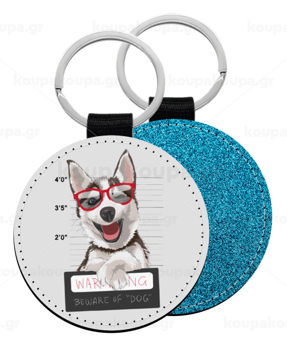 Warning, beware of Dog, Μπρελόκ Δερματίνη, στρογγυλό ΜΠΛΕ (5cm)