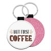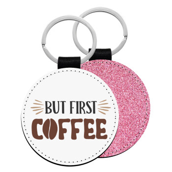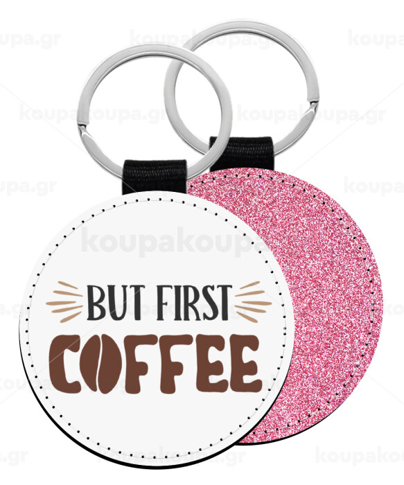 But first Coffee, Μπρελόκ Δερματίνη, στρογγυλό ΡΟΖ (5cm)