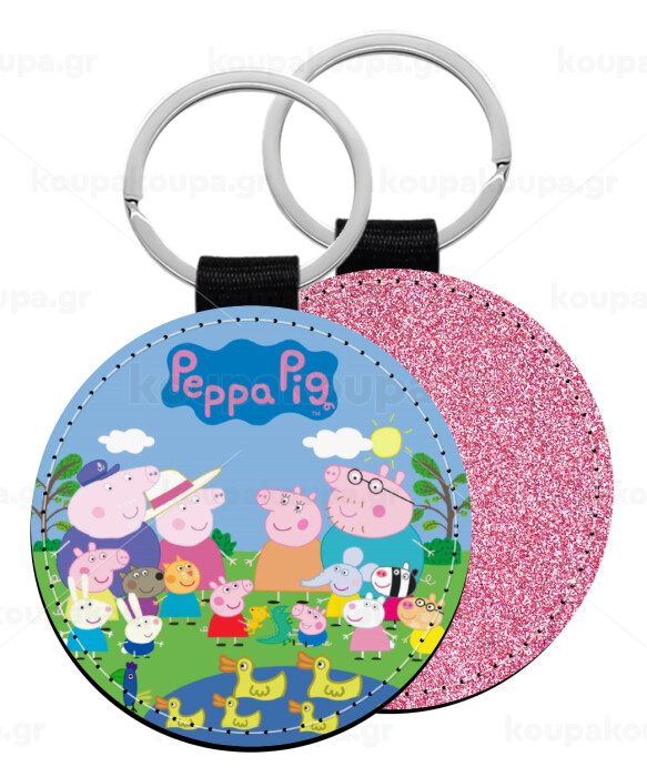 Peppa pig Family, Μπρελόκ Δερματίνη, στρογγυλό ΡΟΖ (5cm)