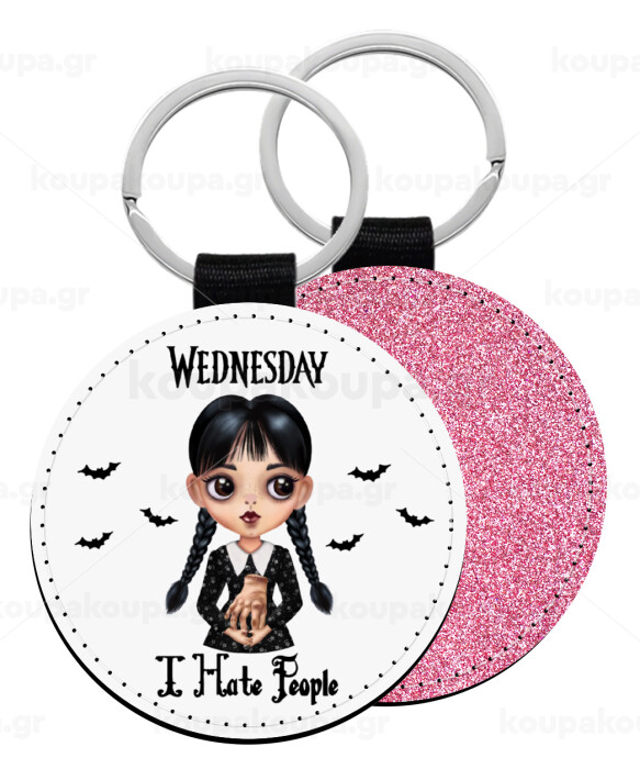 Wednesday Adams, i hate people, Μπρελόκ Δερματίνη, στρογγυλό ΡΟΖ (5cm)
