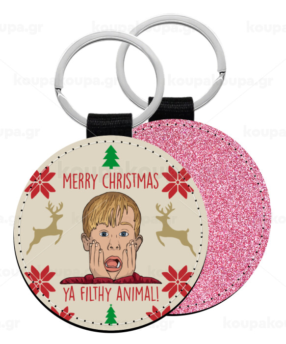home alone, Merry Christmas ya filthy animal, Μπρελόκ Δερματίνη, στρογγυλό ΡΟΖ (5cm)
