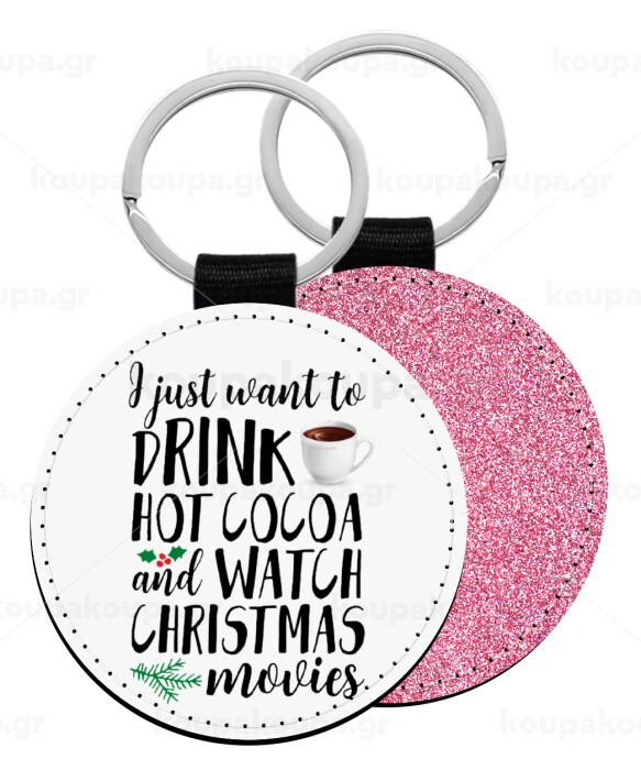 I just want to drink hot cocoa and watch christmas movies, Μπρελόκ Δερματίνη, στρογγυλό ΡΟΖ (5cm)