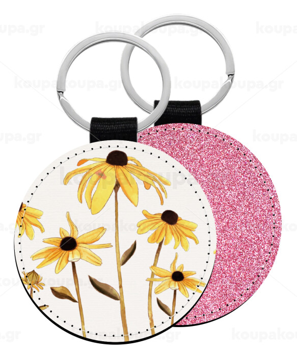 Daisies flower, Μπρελόκ Δερματίνη, στρογγυλό ΡΟΖ (5cm)